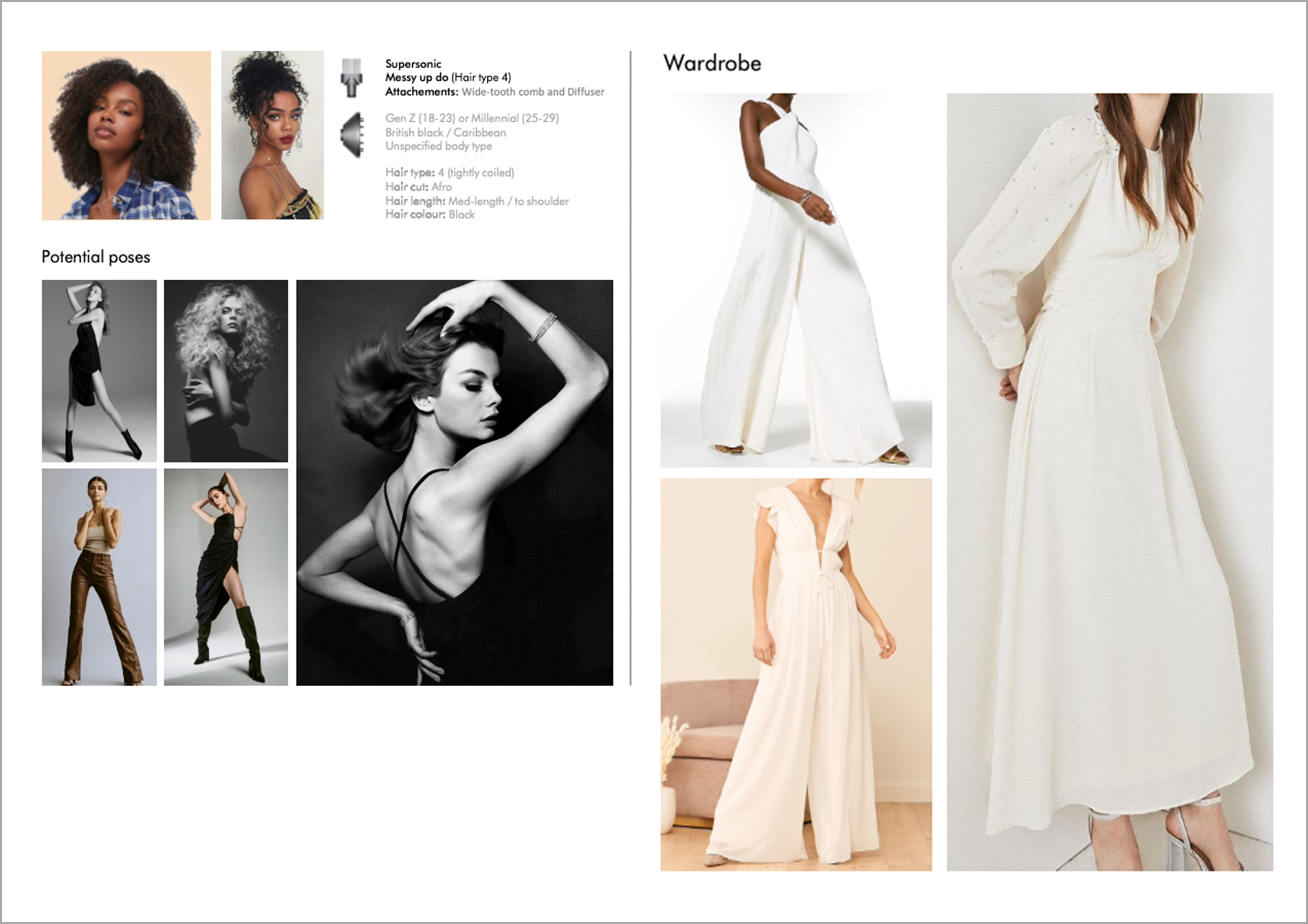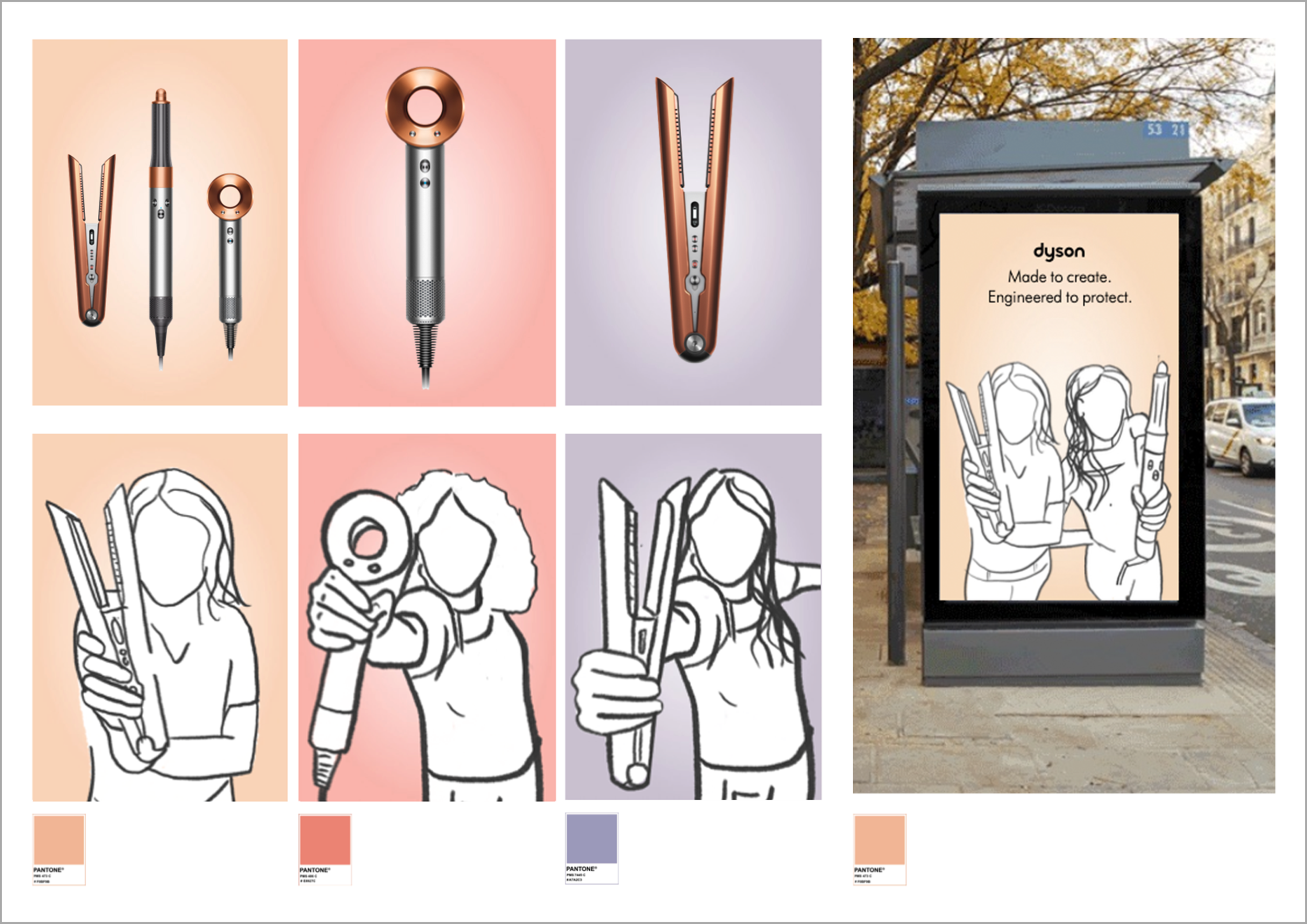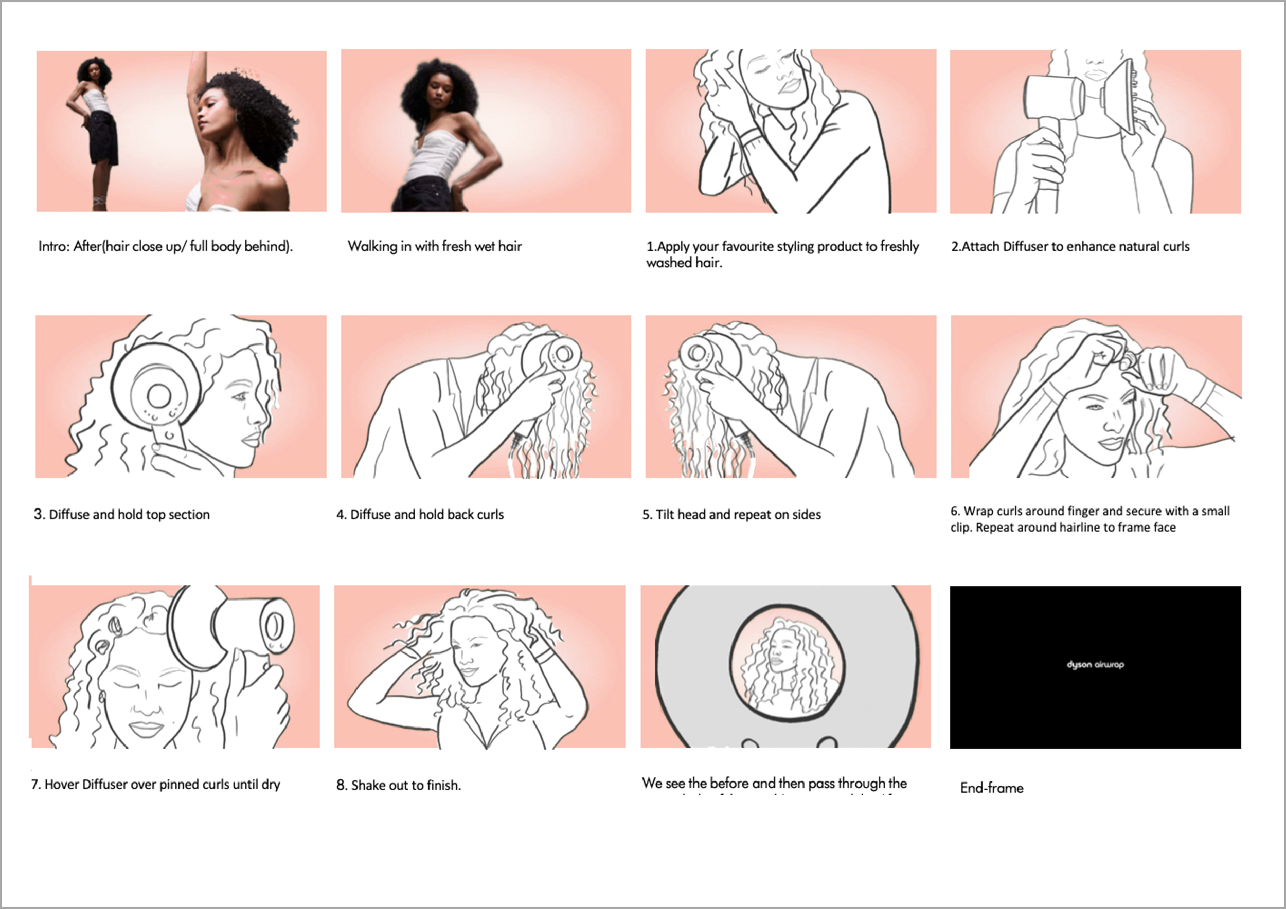 This included crafting and drawing detailed storyboards for the main Cinema Advert and 7 'How-to' styling videos, guiding movement, angles, and wardrobe. I also developed a fresh colour palette, uniquely inspired by Dyson's product range. Collaborating with the photographer, I guided poses, cropping, and camera angles to perfectly capture our vision and showcase Dyson haircare's creative possibilities.